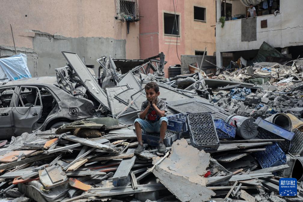 2025年8月8日,一名男孩坐在加沙地带北部加沙城以军袭击后的废墟上。