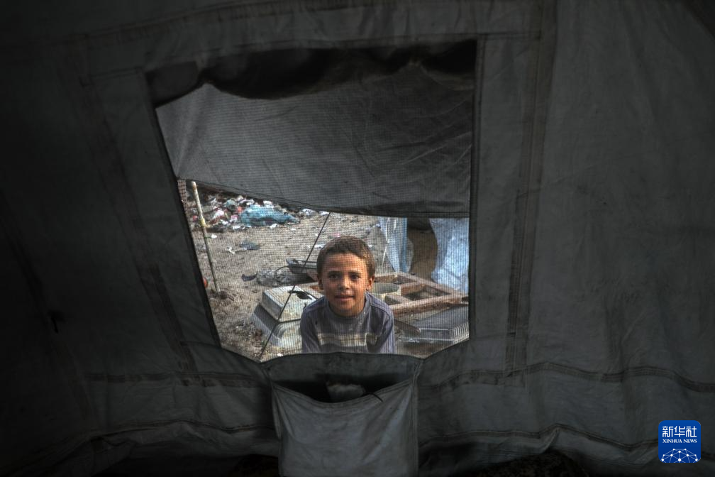 2025年7月29日,在加沙地带北部加沙城,一名男孩望向帐篷里。当地许多家庭仅靠少许入境加沙地带的人道援助物资维系生存。