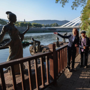 11月20日,在诸暨西施故里景区,参加今年金牌导游选拔的年轻导游(左)在给游客们讲述西施的故事。