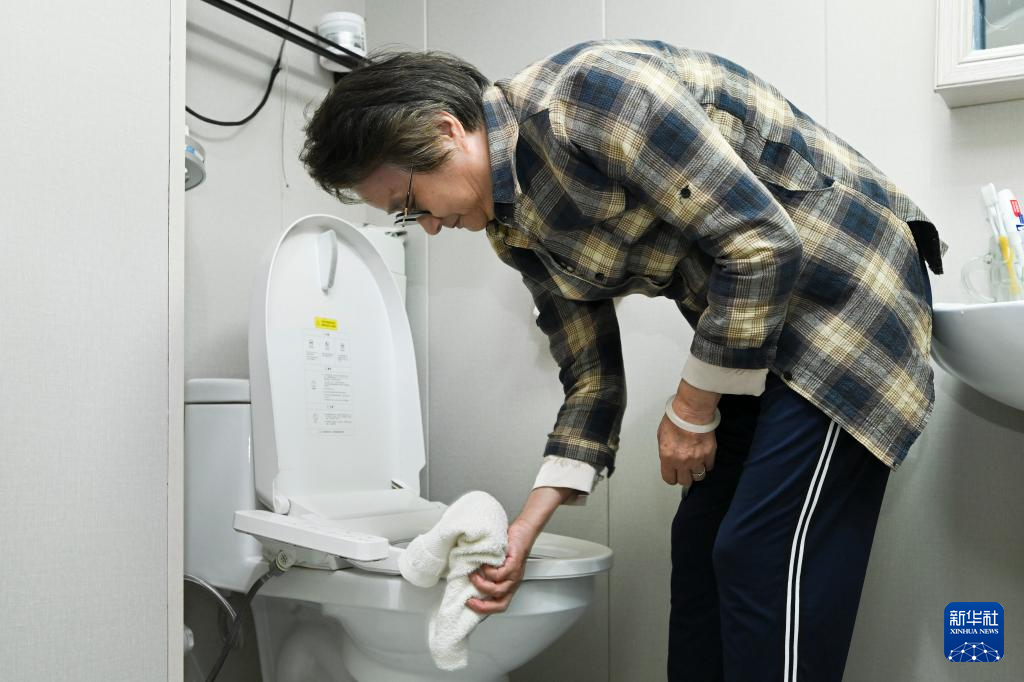 10月29日,上海市杨浦区定海路街道居民陈燕芬擦拭抽水马桶。