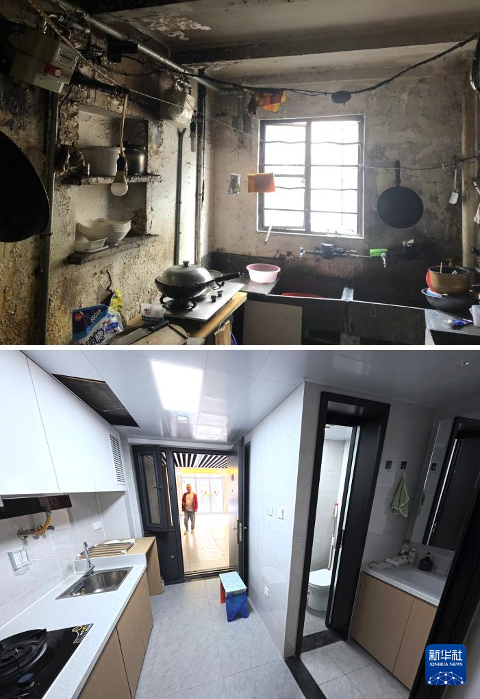 拼版照片:上图是改造前的漕溪三村小区居民共用厨房(资料照片,新华社发);下图是拆除重建后的漕溪三村小区室内独立厨房和卫生间(2025年10月23日摄,新华社记者方喆摄)。