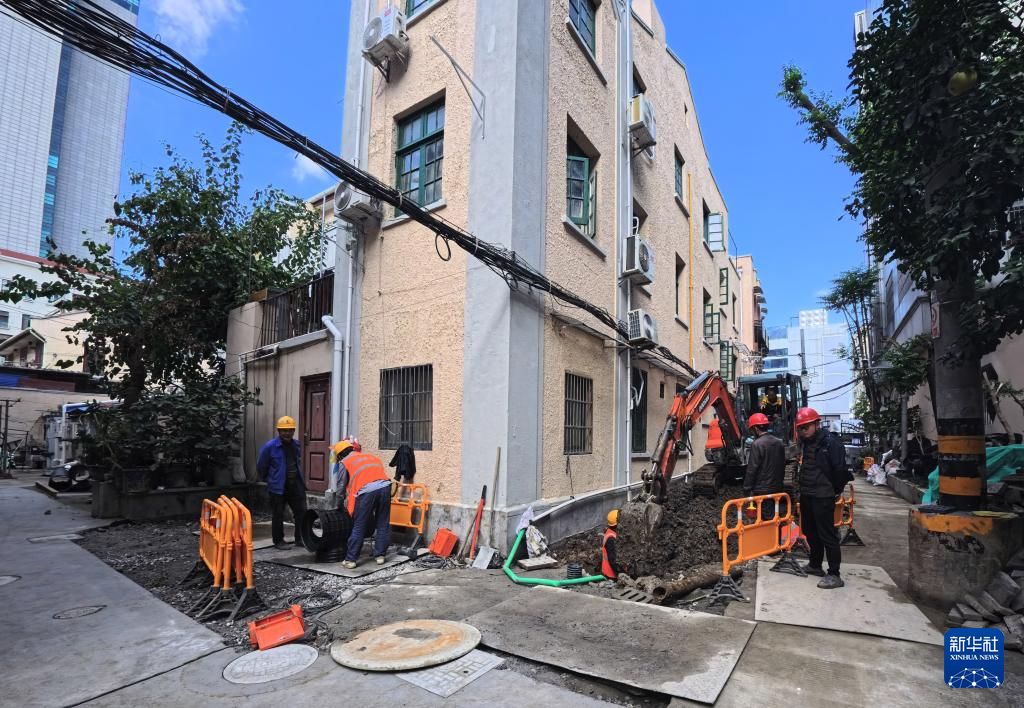 这是10月31日拍摄的愚园路1407弄小区污水管道更新施工现场。