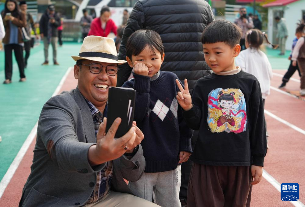 11月4日,一名印度尼西亚“村长班”学员在参观山东龙口市南山幼儿园时与小朋友合影。