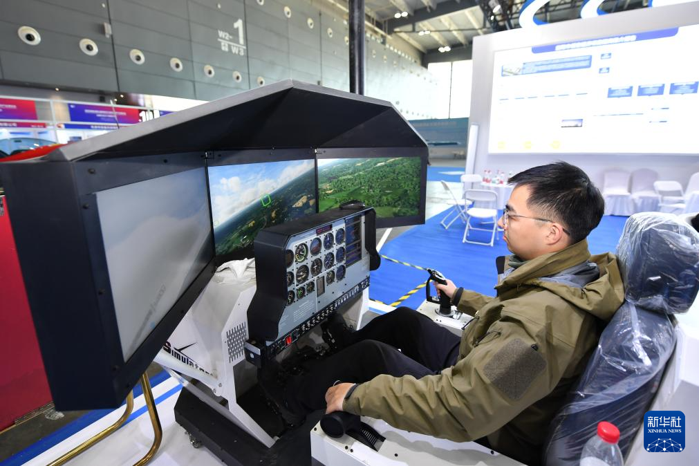 11月21日,观众在长沙国际会展中心操作模拟飞机。