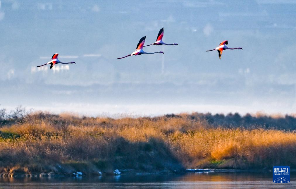 11月19日,火烈鸟在山西省运城盐湖湿地飞翔。