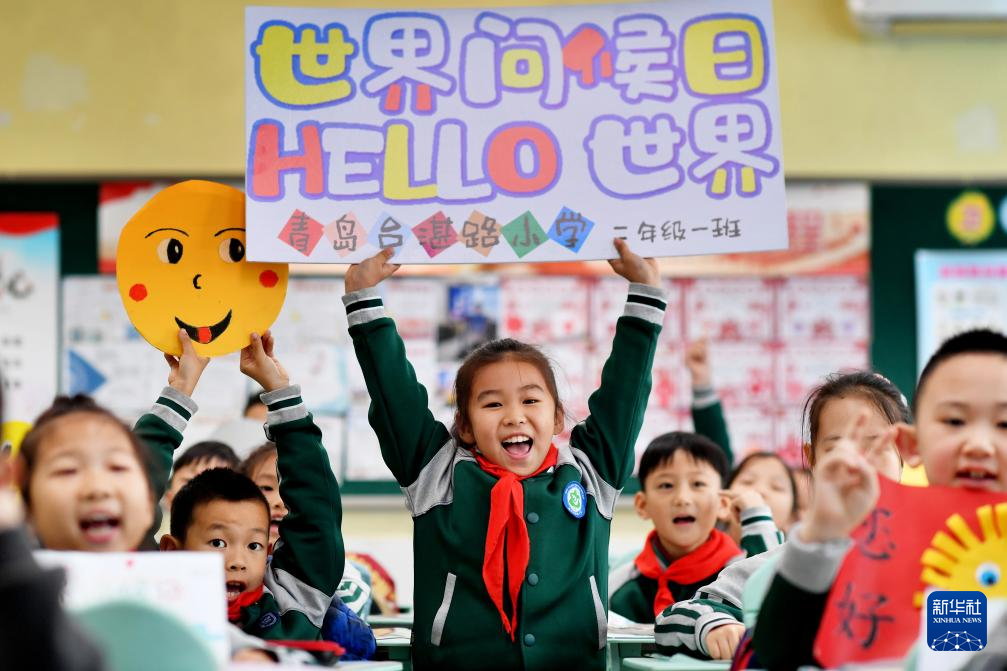 11月20日,学生们在山东省青岛市市北区台湛路小学开展的“世界问候日”主题活动上展示问候牌。