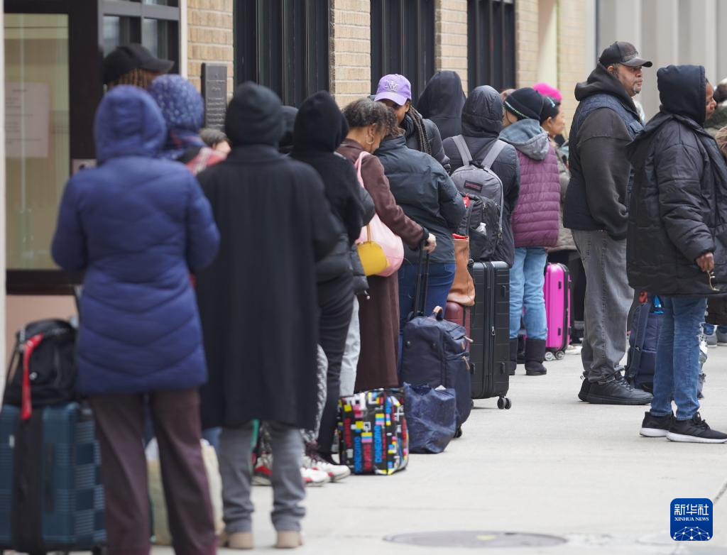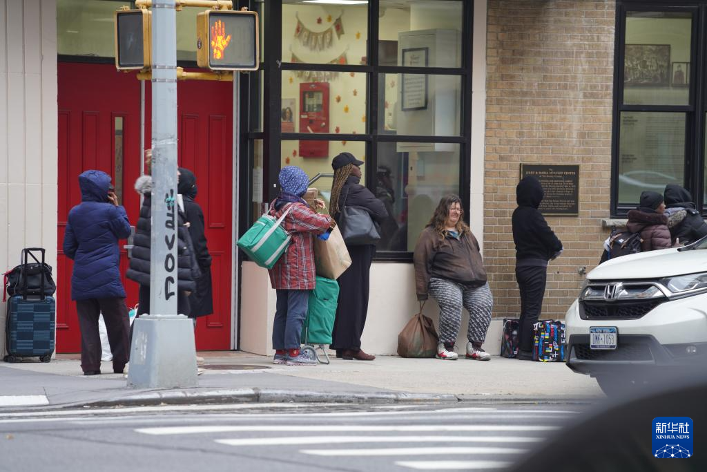 11月21日,在美国纽约一处无家可归者救助点,人们带着行李排队等待救助。