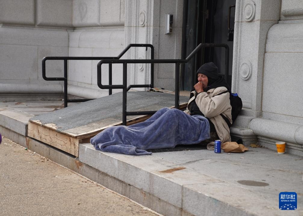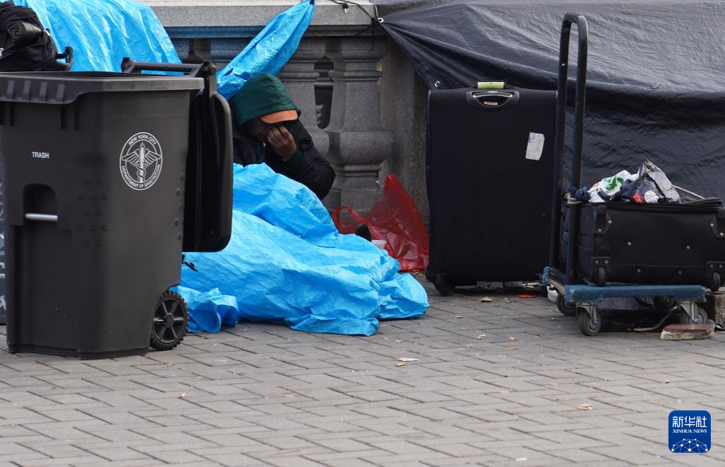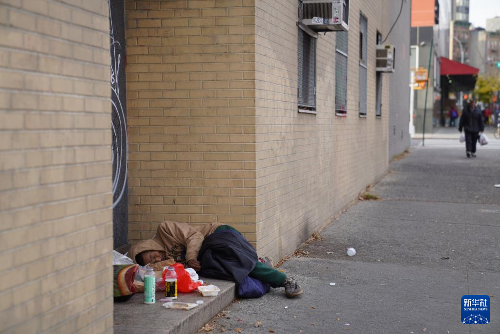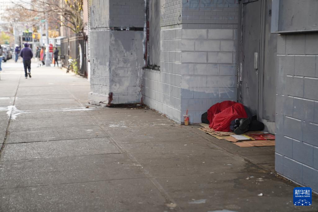 11月21日,在美国纽约一处无家可归者救助点附近,一名无家可归者露宿街头。