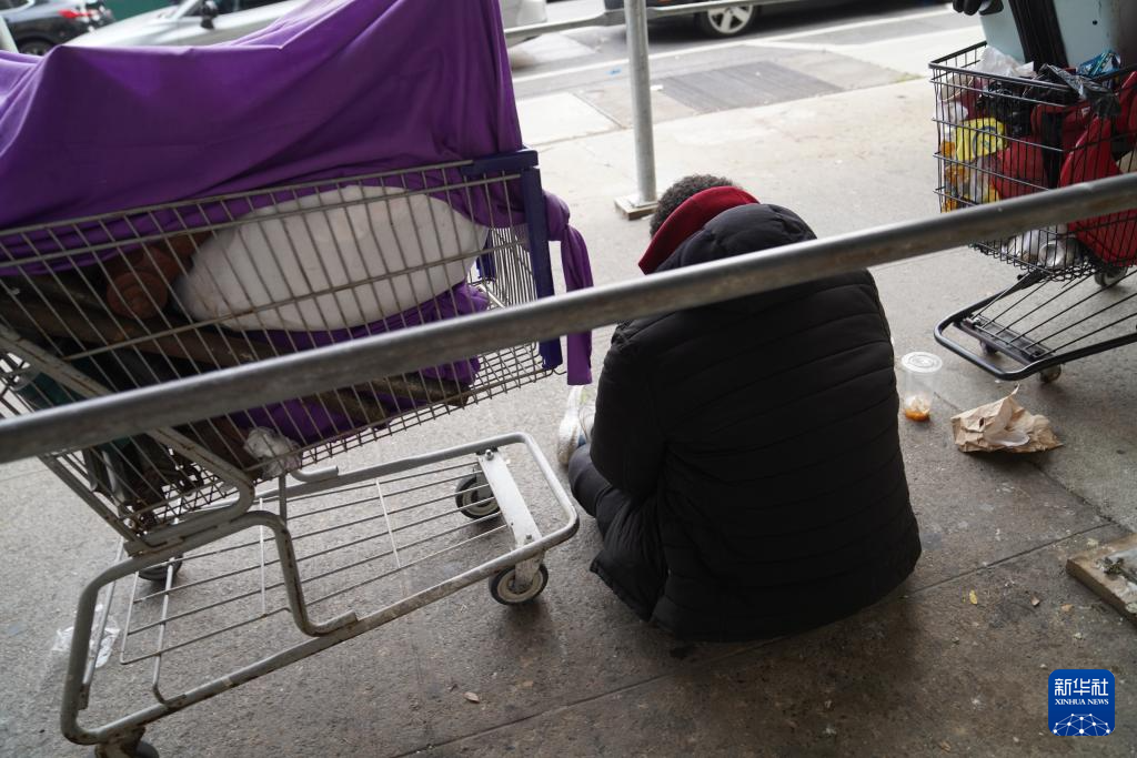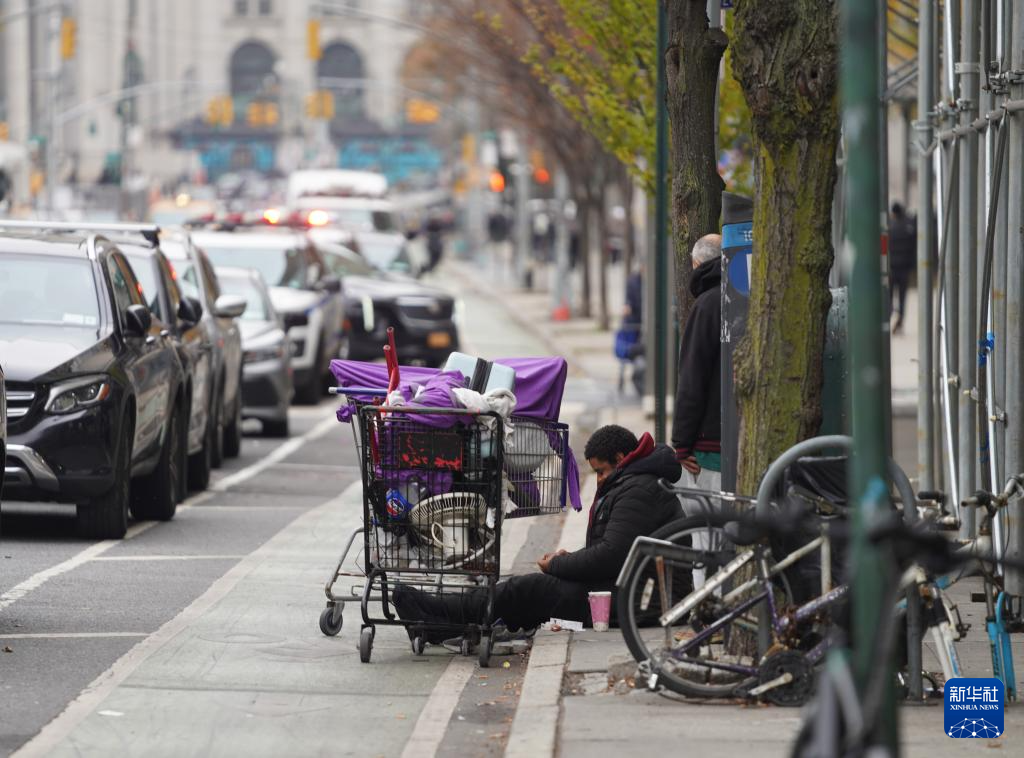 11月21日,在美国纽约一处无家可归者救助点附近,一名无家可归者坐在街头。