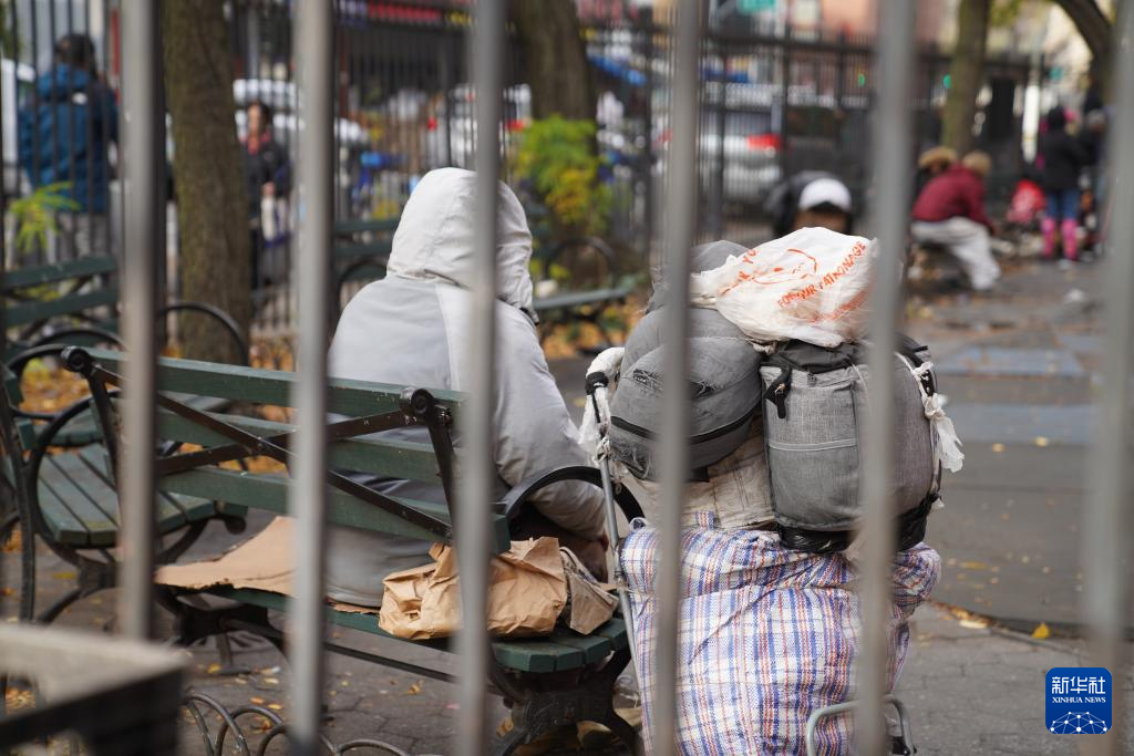 11月21日,在美国纽约一处无家可归者救助点附近,一名无家可归者带着行李坐在公园里。