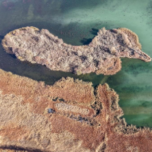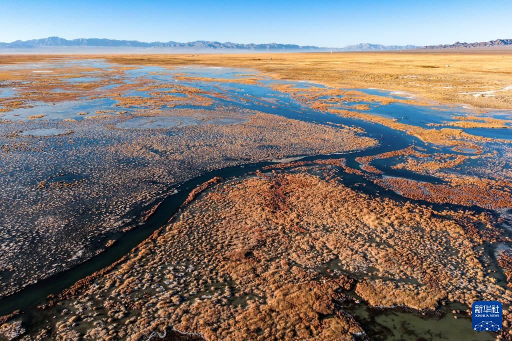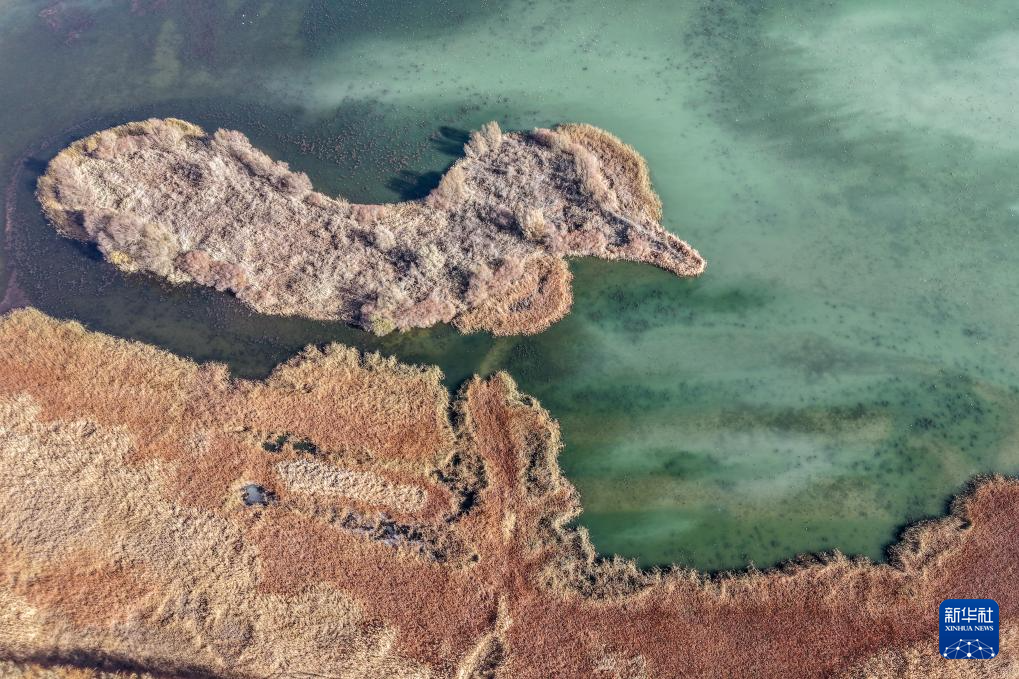 这是11月14日在河西走廊西端的甘肃省阿克塞县小苏干湖湿地拍摄的一片水域(无人机照片)。