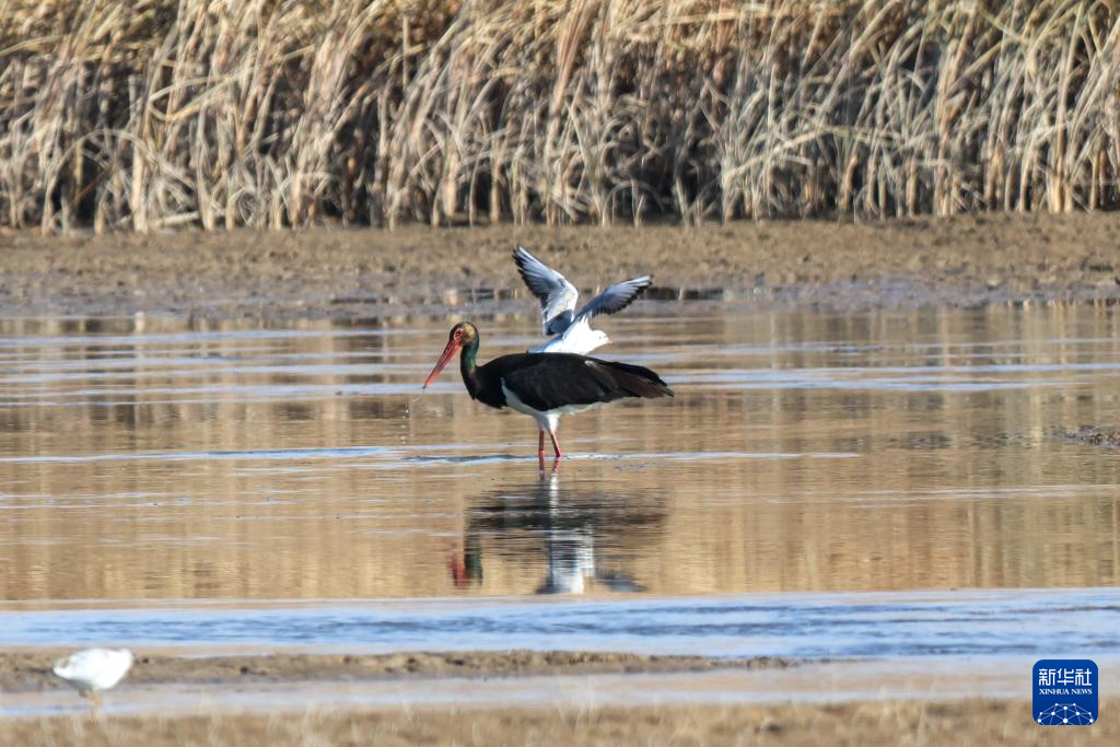 11月12日,在河西走廊中部的张掖黑河湿地国家级自然保护区高台段,国家一级保护野生动物黑鹳在一处湿地浅滩觅食。