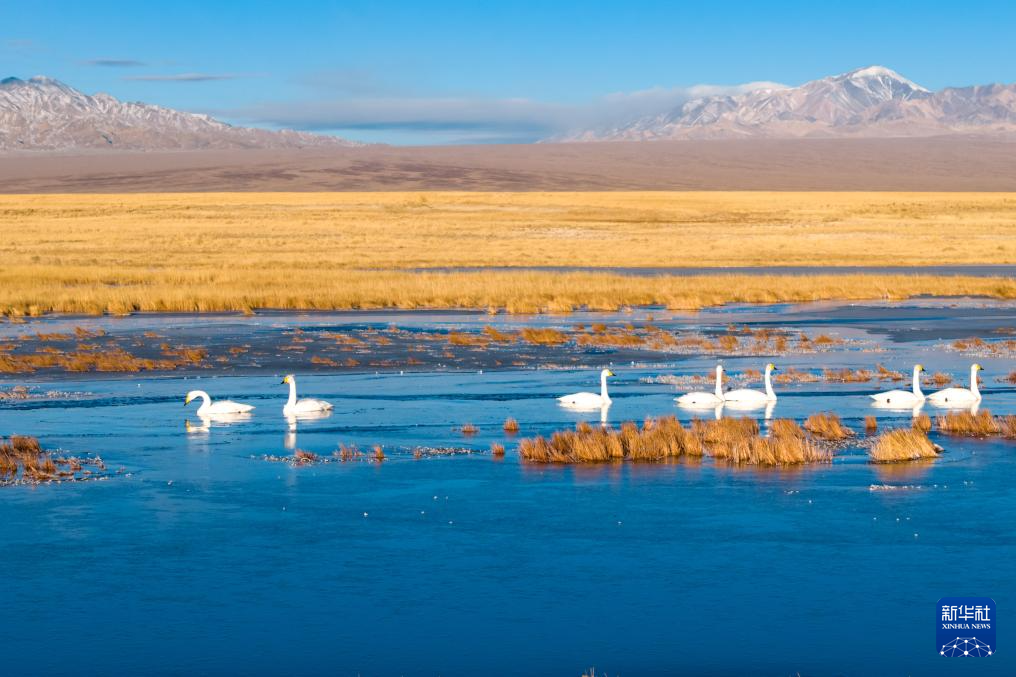11月14日,在河西走廊西端的甘肃省阿克塞县小苏干湖湿地,大天鹅在一处水域游弋觅食(无人机照片)。