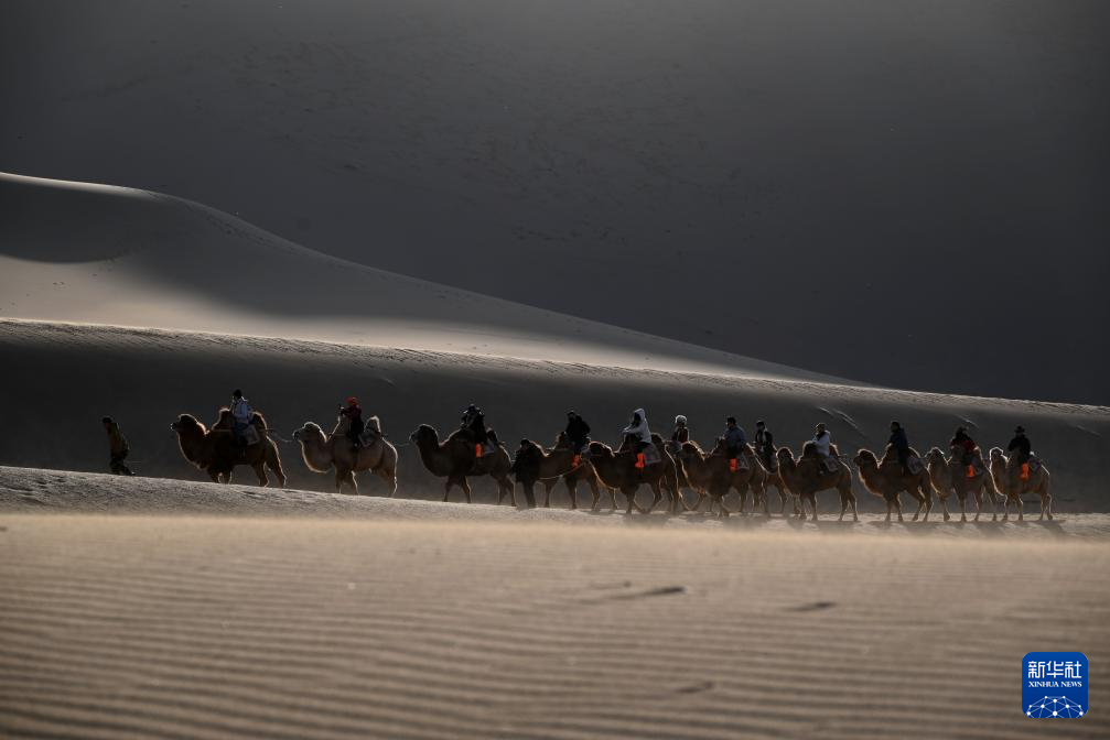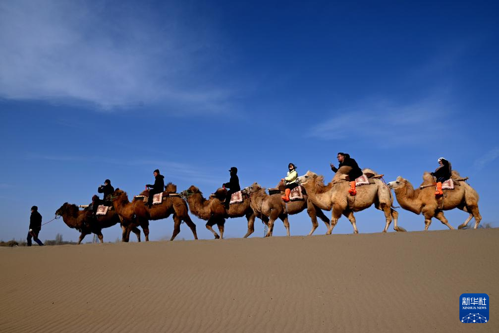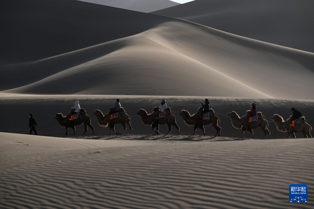 冬日时节,甘肃省敦煌市鸣沙山月牙泉景区暖阳高照,驼铃悠扬,景色如画,游客徜徉其中欣赏大漠风光,体验丝路风情。