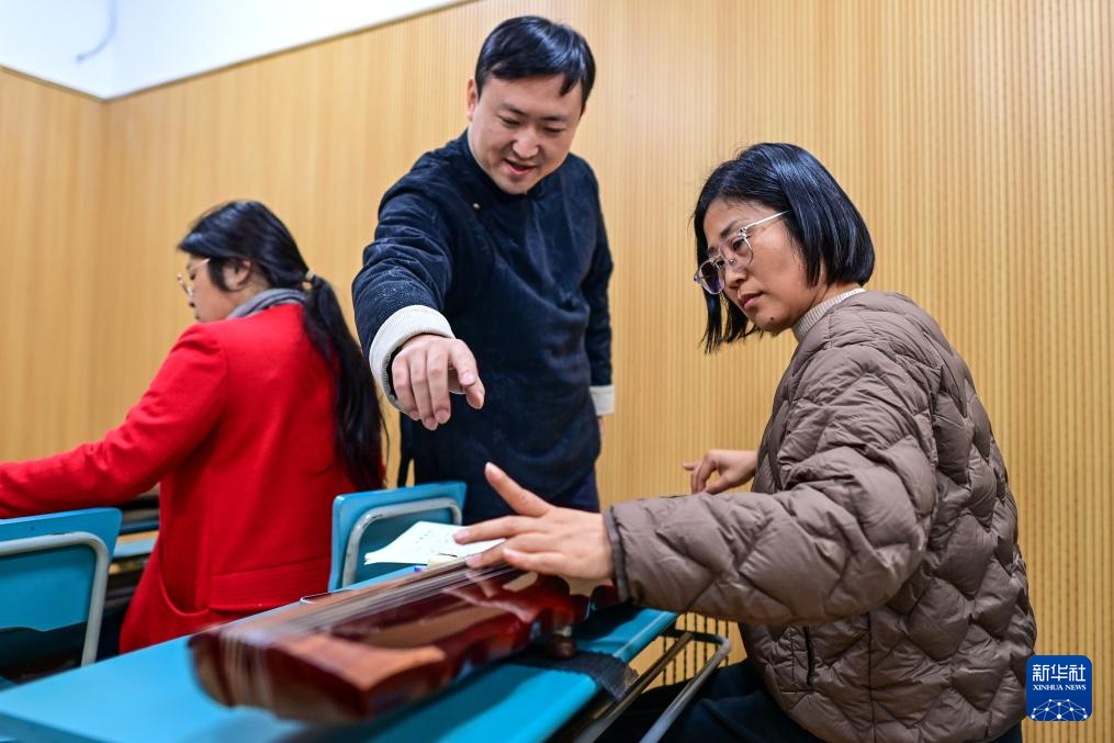 11月26日,在宁波市江北青少年活动中心的青年夜校内,老师(中)在青年夜校的古琴课上指导学员。