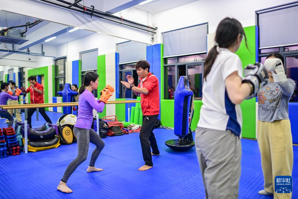 11月26日,在宁波市江北青少年活动中心,教练员(左二)在青年夜校的自由搏击课上指导学员。