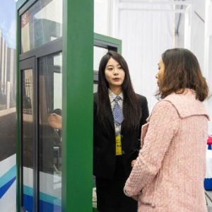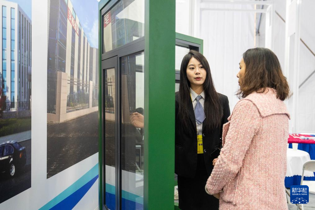 11月27日,在娄底经开区电力科技谷,参展商(左)在介绍复合材料门窗。