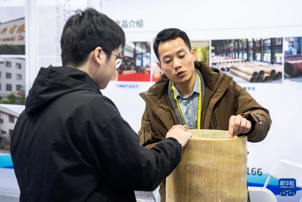 11月27日,在娄底经开区电力科技谷,参展商(右)在介绍竹缠绕复合材料。