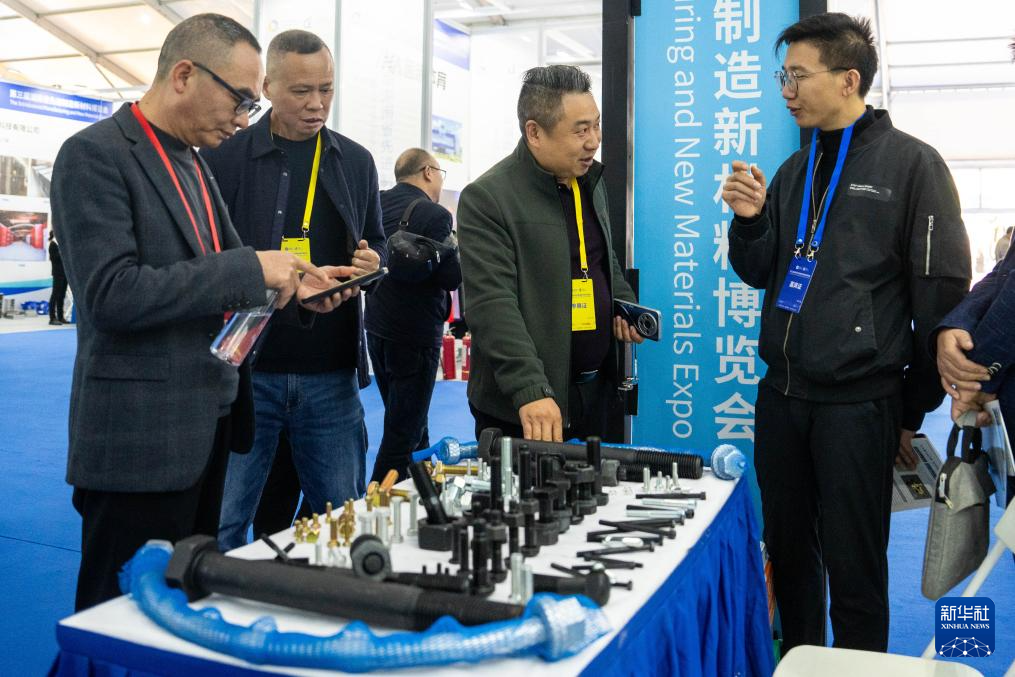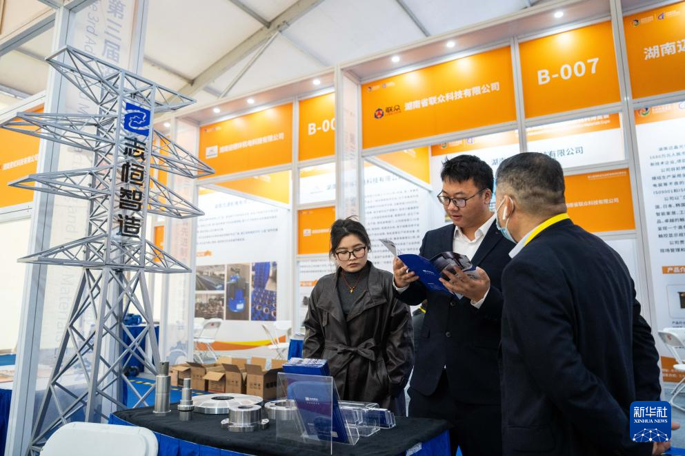 11月27日,在娄底经开区电力科技谷,参观者(右一)在了解高强度紧固件产品。