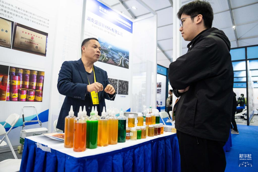 11月27日,在娄底经开区电力科技谷,参展商(左)在介绍金属切削液。