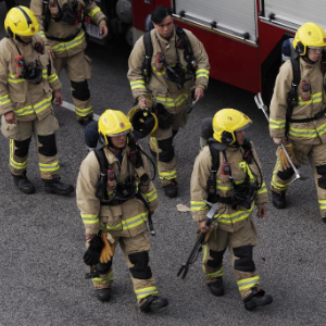11月27日,消防员携带破拆工具进入火灾救援现场。