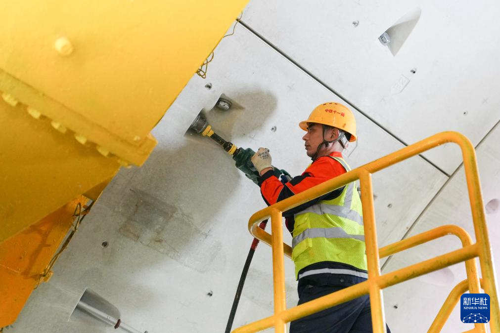 11月28日,中铁十一局技术人员在甬舟铁路金塘海底隧道“定海号”盾构机内进行管片拼装作业。