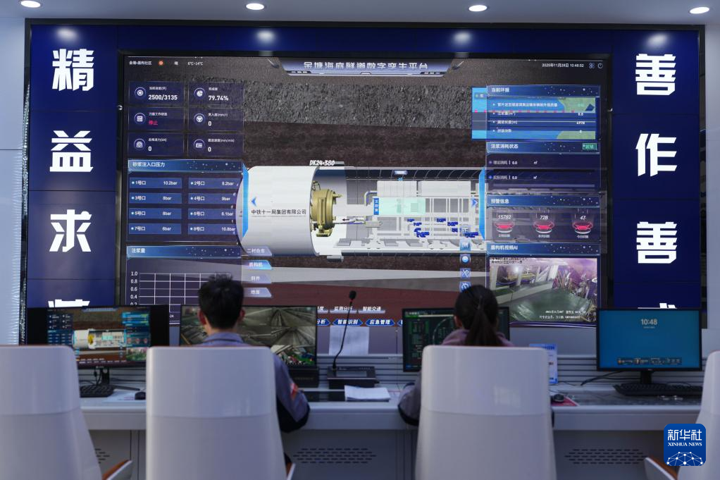 11月28日,中铁十一局技术人员通过甬舟铁路金塘海底隧道数字孪生平台进行远程施工管理。