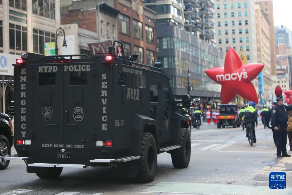 11月27日,在美国纽约,警方应急车辆在感恩节游行活动现场巡逻。
