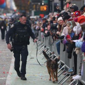 11月27日,在美国纽约,警察携带警犬在感恩节游行活动现场值守。