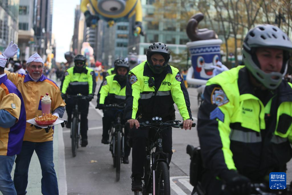 11月27日,在美国纽约,警察在感恩节游行活动现场骑车巡逻。