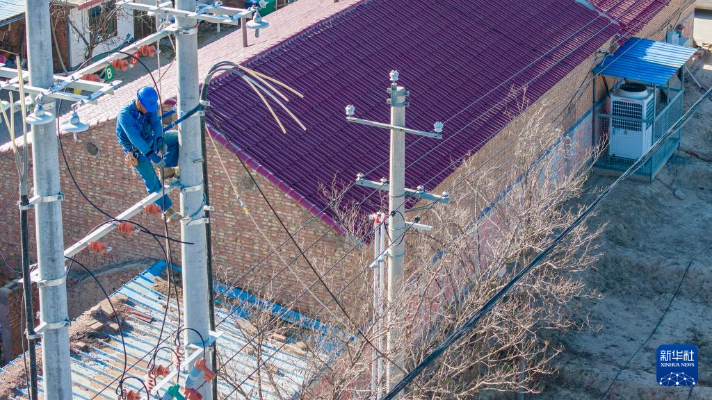 11月27日,当地供电部门工作人员在宁夏吴忠市同心县河西镇旱天岭村进行“煤改电”配套供电工程施工(无人机照片)。