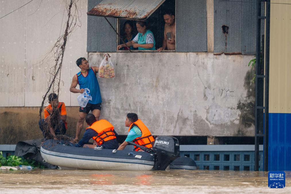11月25日,在泰国宋卡府合艾市郊,救援人员为受困居民运送物资。