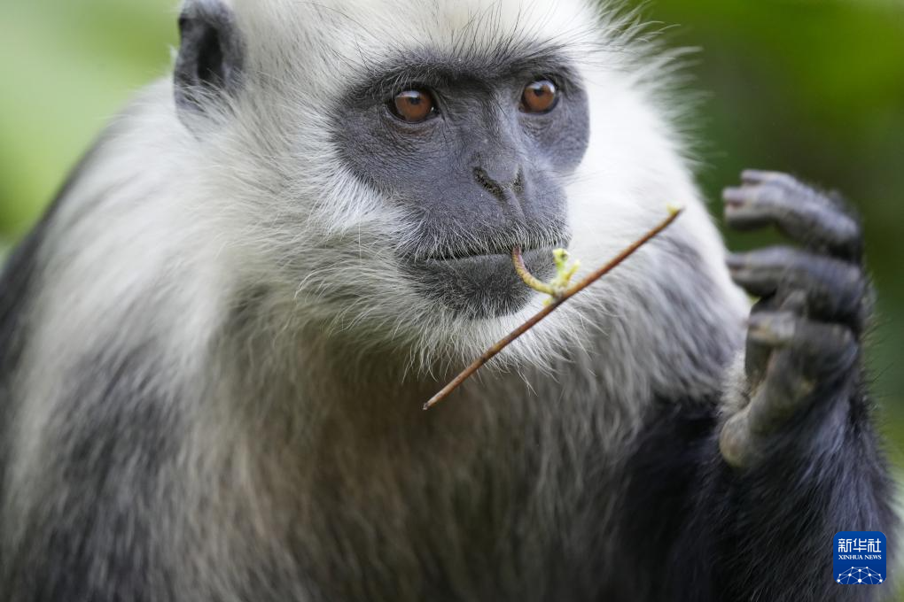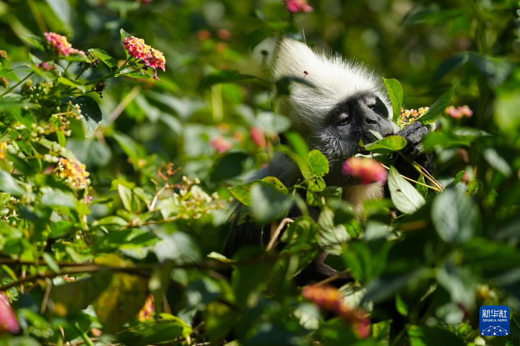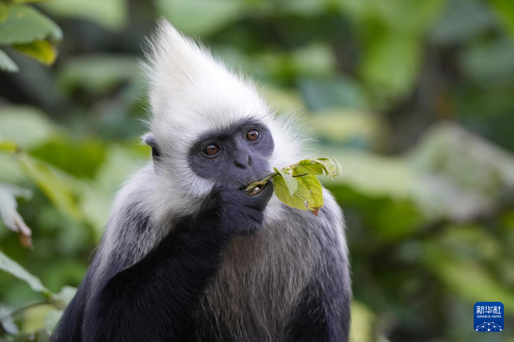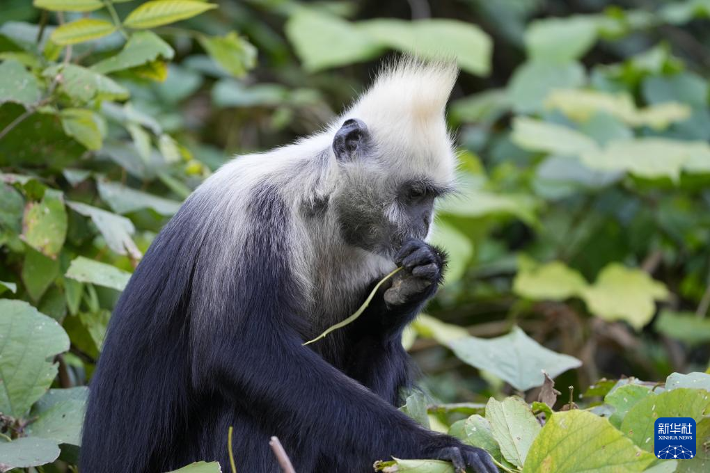 在广西崇左白头叶猴国家级自然保护区板利片区,白头叶猴在茂密的树林间穿梭觅食,黑白的毛发与绿色的枝叶相映成趣。白头叶猴是国家一级重点保护野生动物,因头顶毛发呈白色、以树叶为食而得名。
