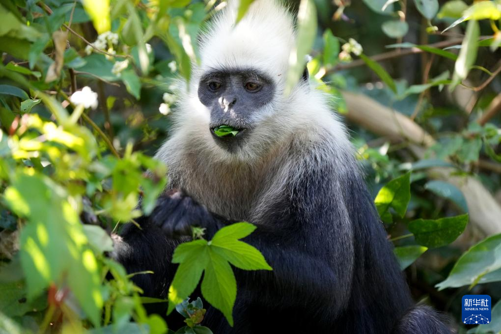 11月26日,在广西崇左白头叶猴国家级自然保护区板利片区,一只白头叶猴在吃树叶。