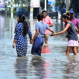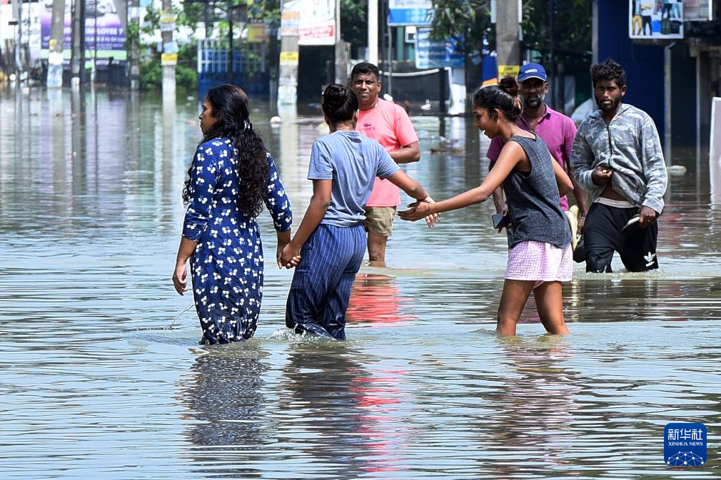 12月1日,在斯里兰卡首都科伦坡郊区,当地居民涉水出行。