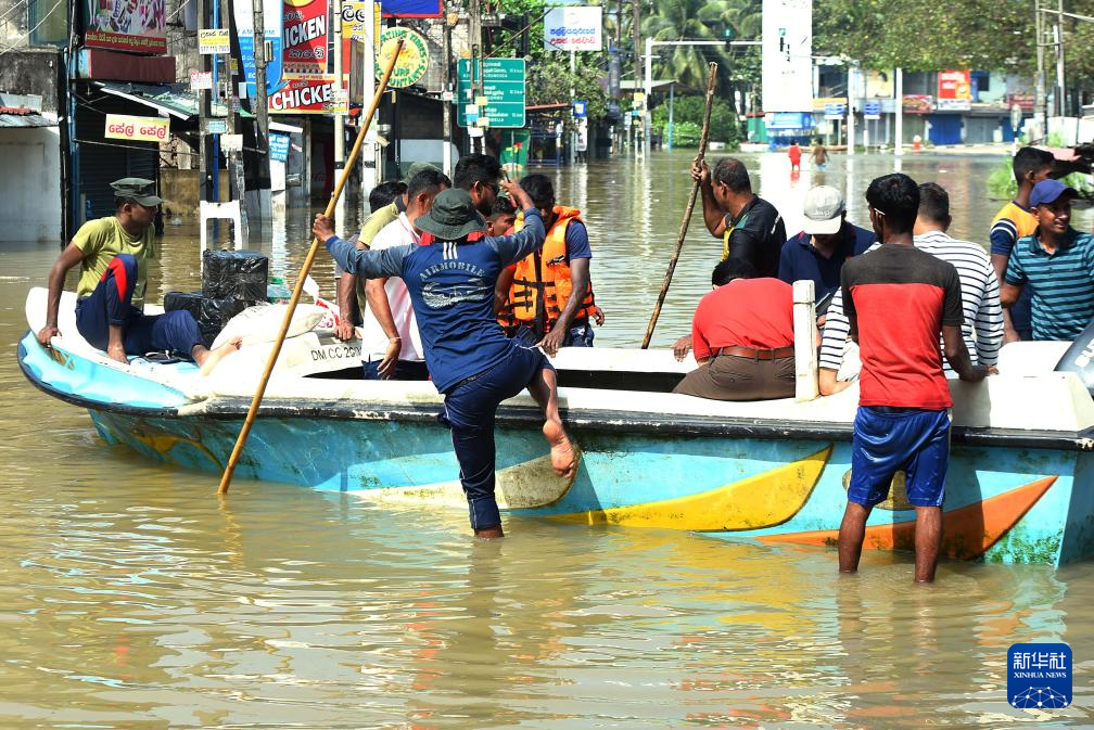 12月1日,在斯里兰卡首都科伦坡郊区,救援人员将受洪涝影响的民众转移至安全地点。