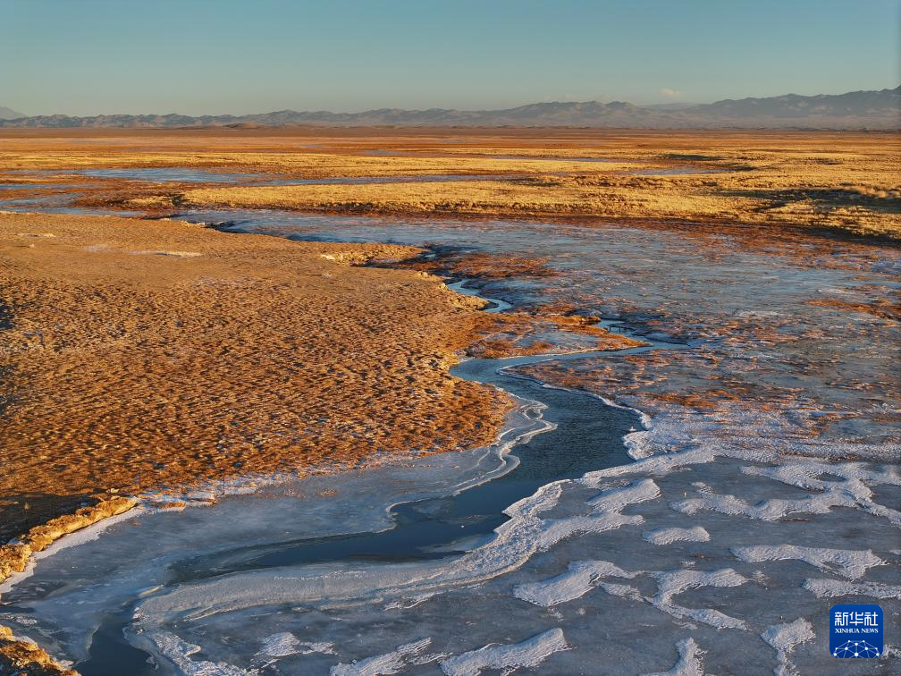 这是12月1日在甘肃省阿克塞哈萨克族自治县阿勒腾乡哈尔腾村拍摄的大哈尔腾河冬景(无人机照片)。