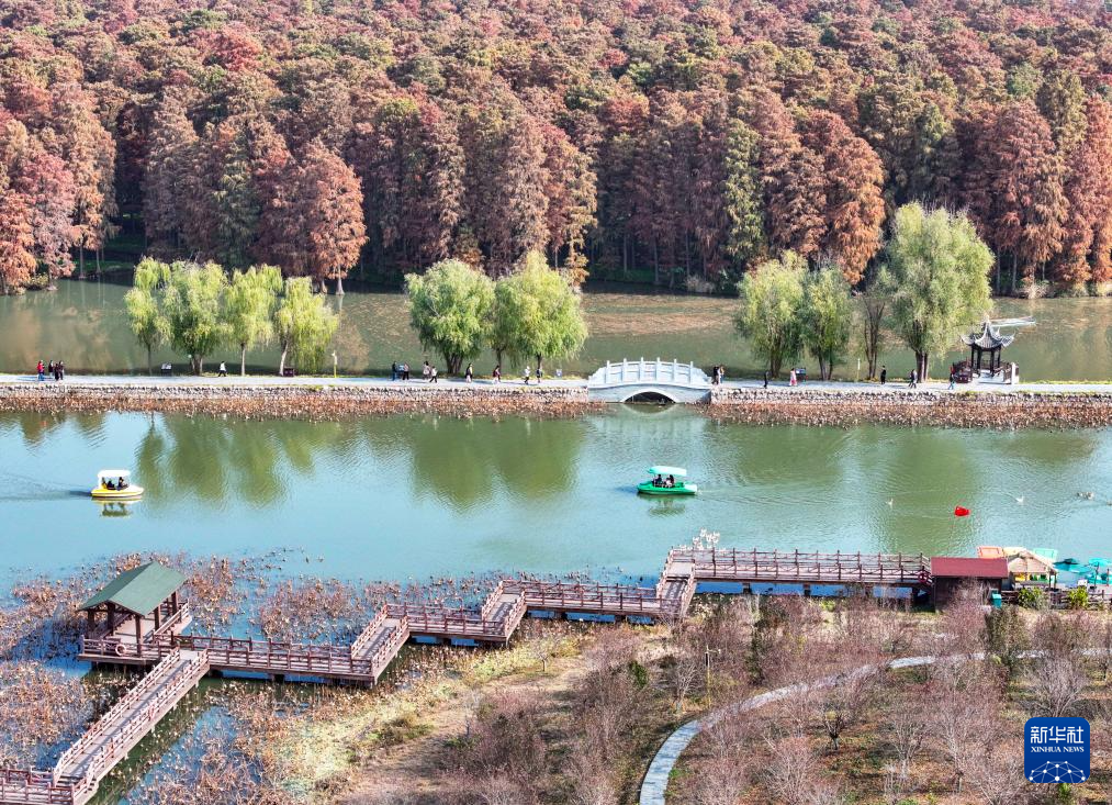 12月2日,游客在江苏省泰州市姜堰区溱湖国家湿地公园赏景游玩(无人机照片)。