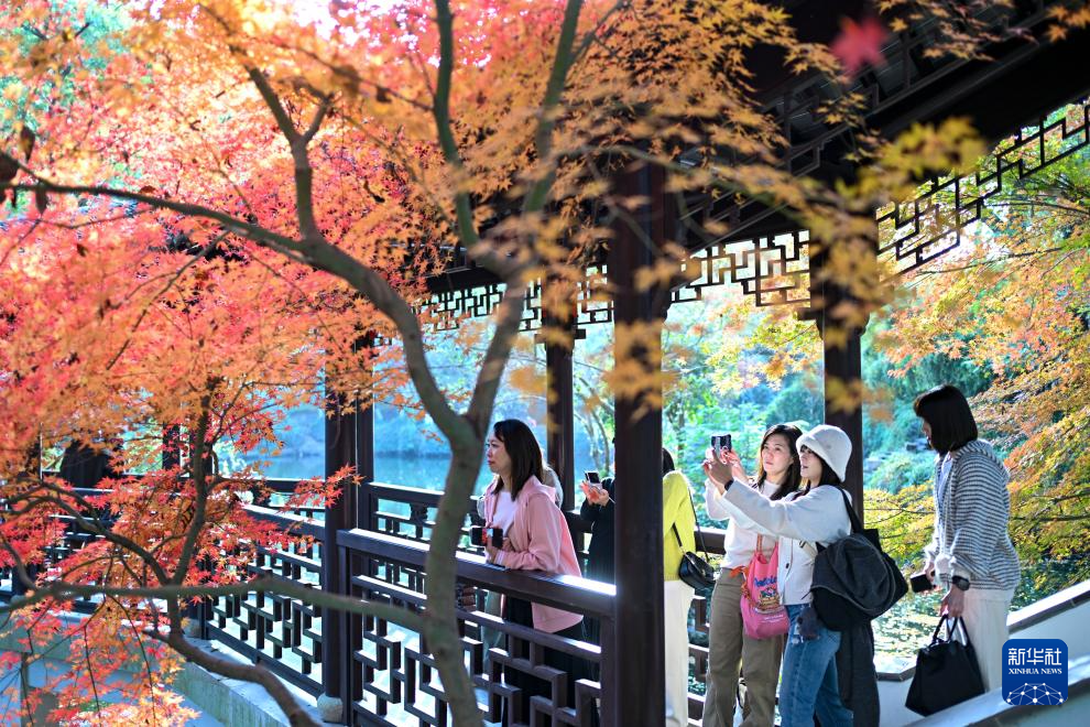 12月1日,游客在江苏省昆山市亭林园赏枫拍照。