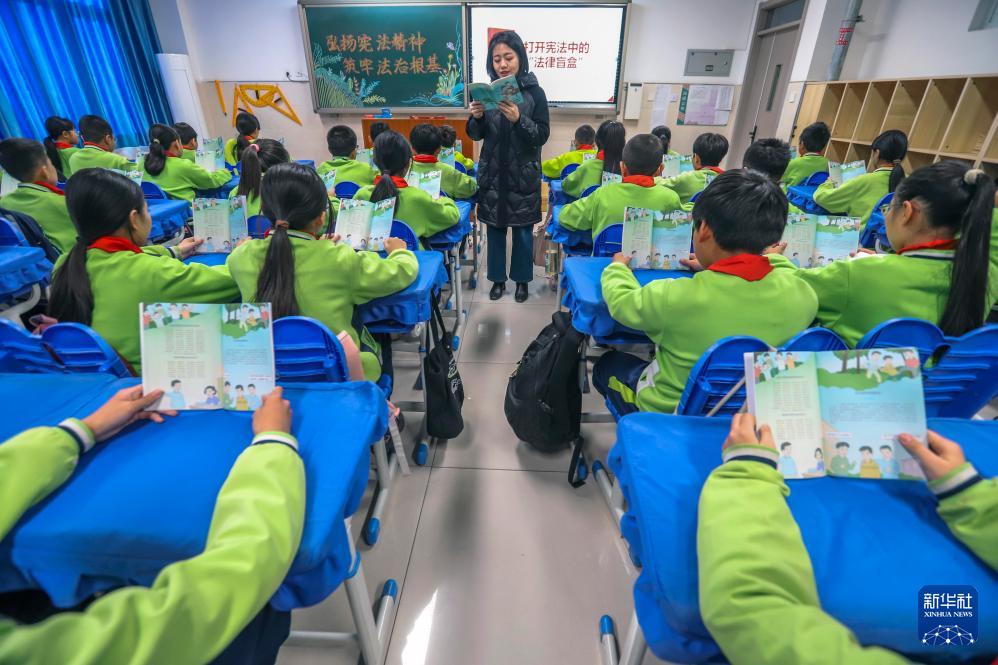 12月2日,在江苏省兴化市文峰小学,兴化市人民检察院未成年人法治宣讲团的工作人员为学生讲解宪法知识。