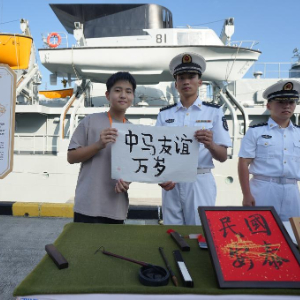 12月1日,在马来西亚巴生港,参观者在中国海军989编队组织的舰艇开放活动上展示书法。