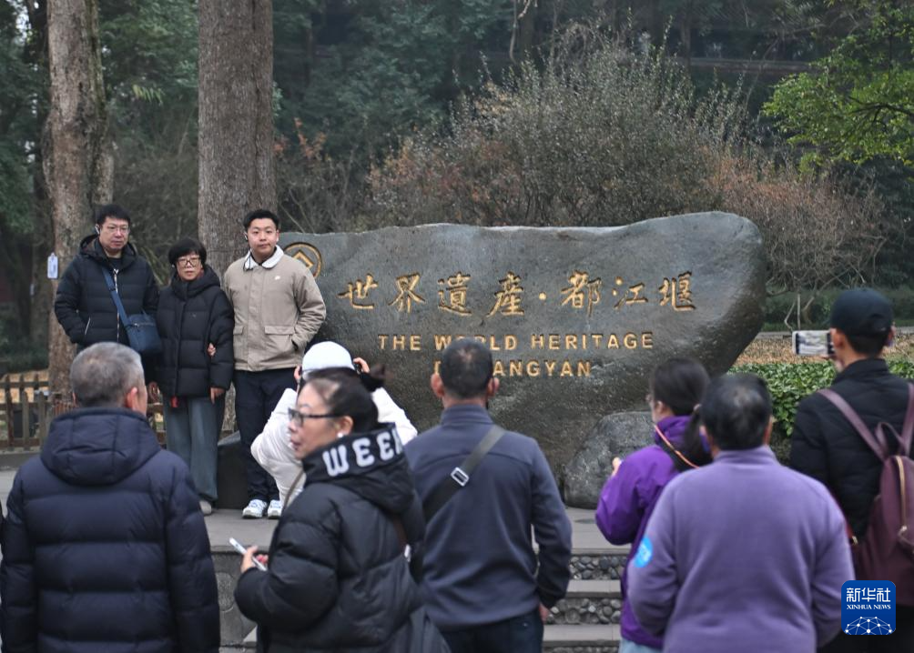 12月6日,游客在都江堰景区内的堰功道游玩。为了纪念治水先贤,都江堰人修建了这条堰功道,两侧放置了十二尊青铜雕像,分别代表了各历史时期治水建堰的有功之臣。
