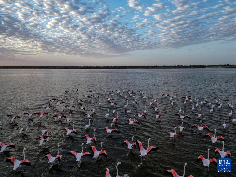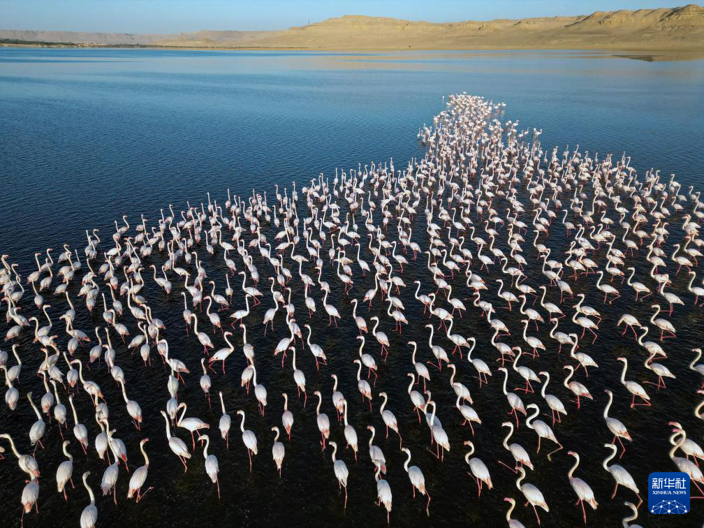 这是12月6日在埃及法尤姆省加龙湖拍摄的火烈鸟(无人机照片)。