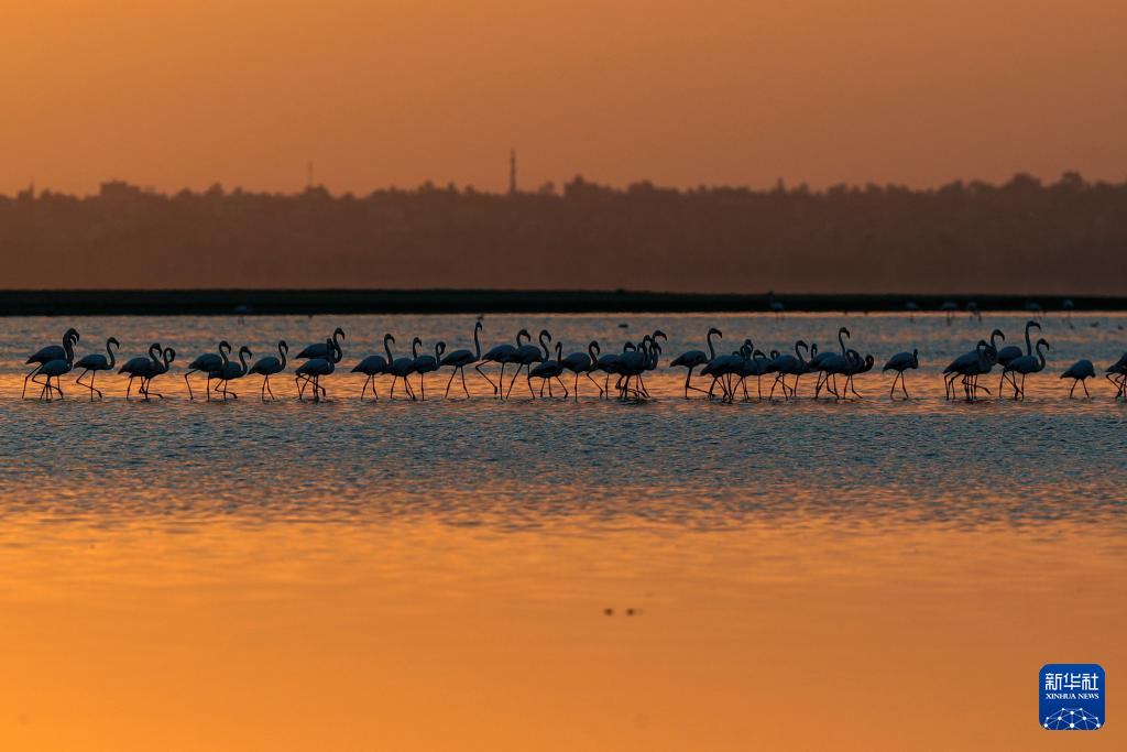 这是12月6日日出时分在埃及法尤姆省加龙湖拍摄的火烈鸟。