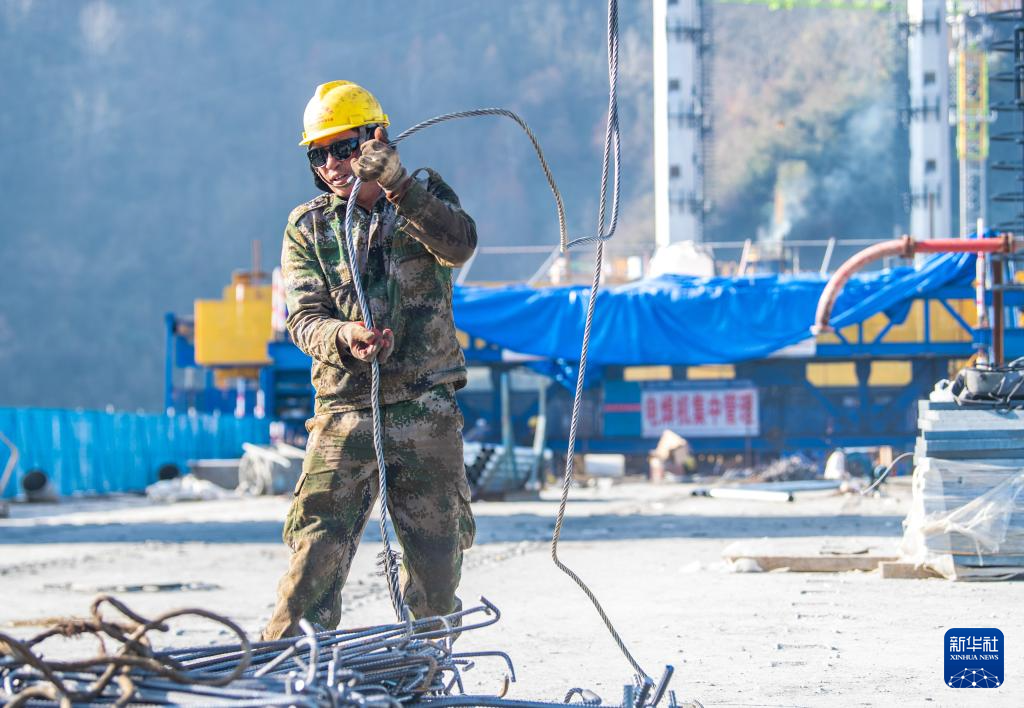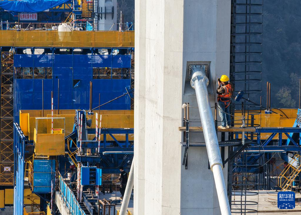 12月7日,工人在西渝高铁任河特大桥建设现场施工作业。