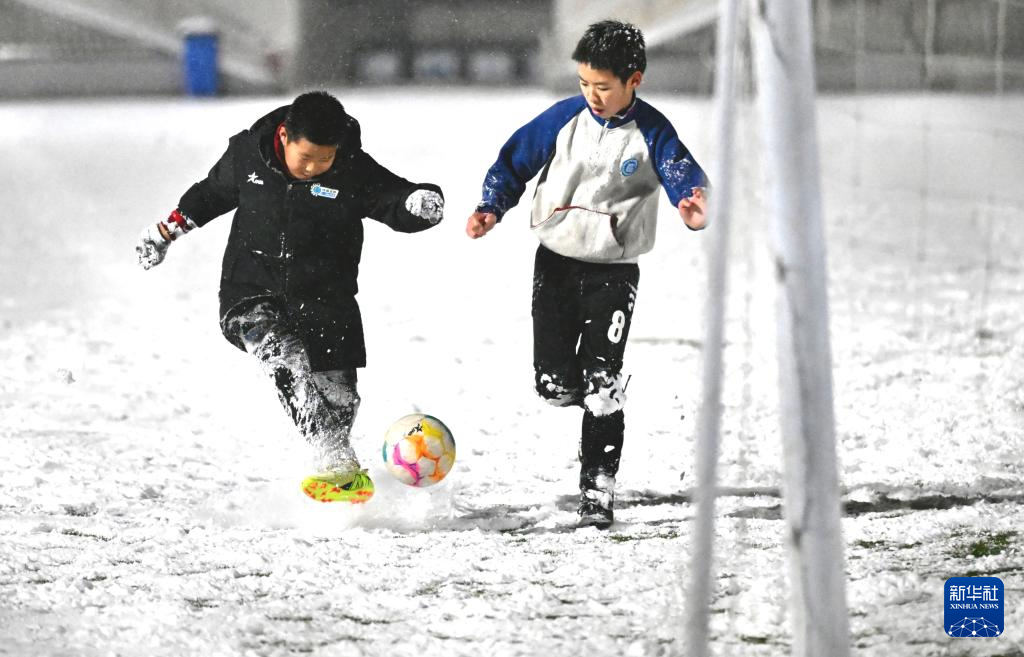 12月12日晚,孩子们在北京月坛体育中心参加足球训练。
