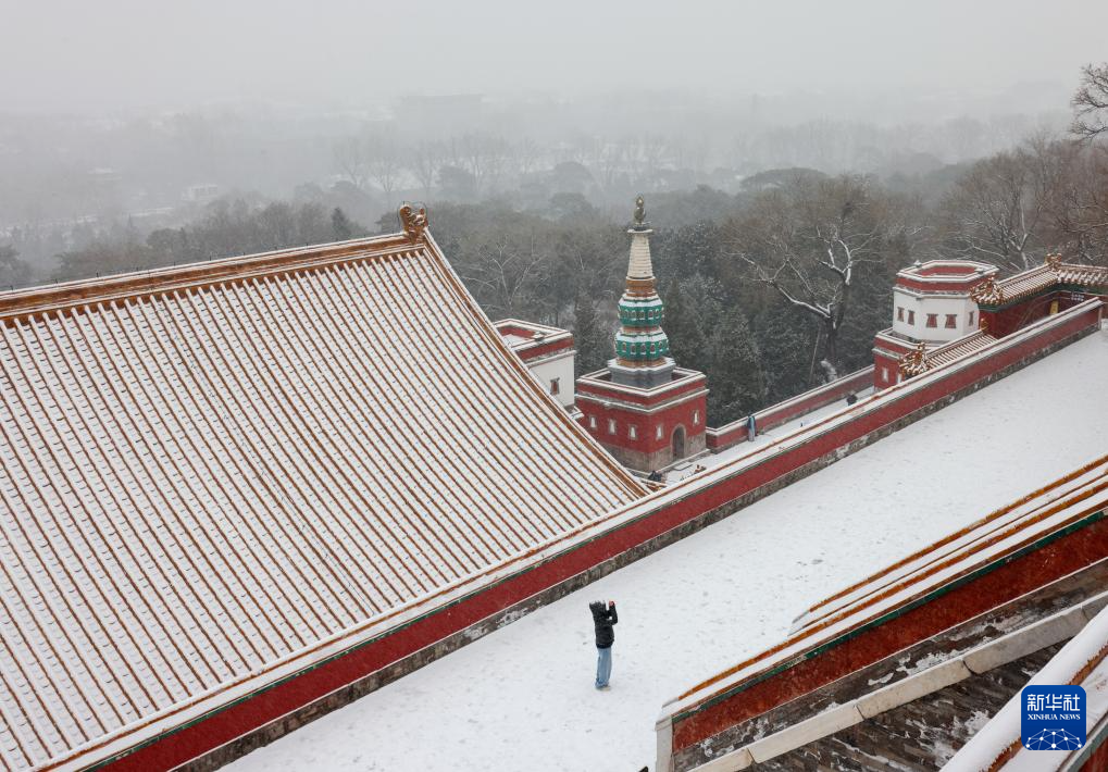 12月12日,一名游客在颐和园四大部洲景区拍摄雪景。
