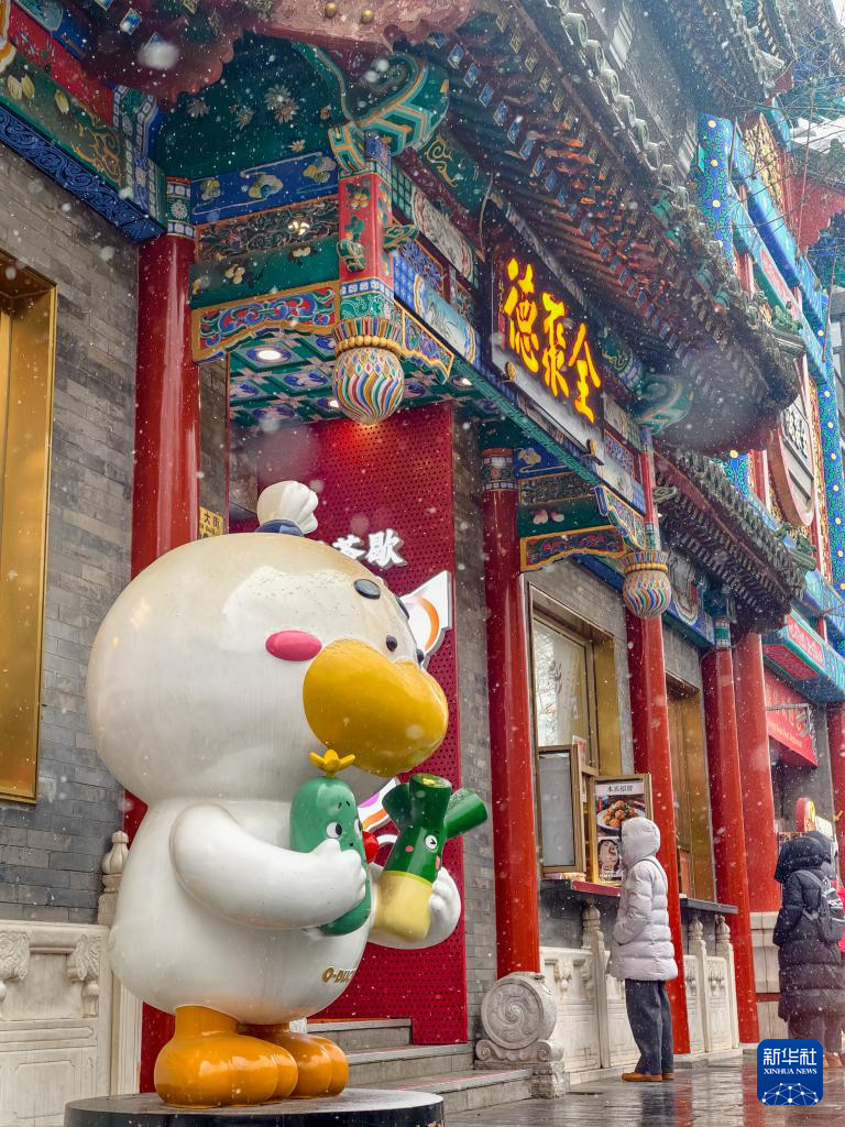 12月12日,顾客冒雪在北京全聚德前门店的外卖窗口购物(手机照片)。