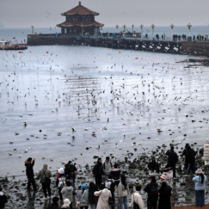 冬日,众多海鸥聚集在青岛栈桥景区飞舞、觅食,成为当地冬季旅游的标志性景观。