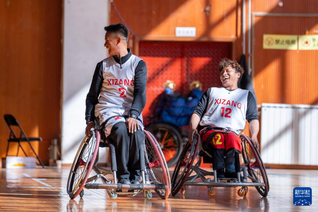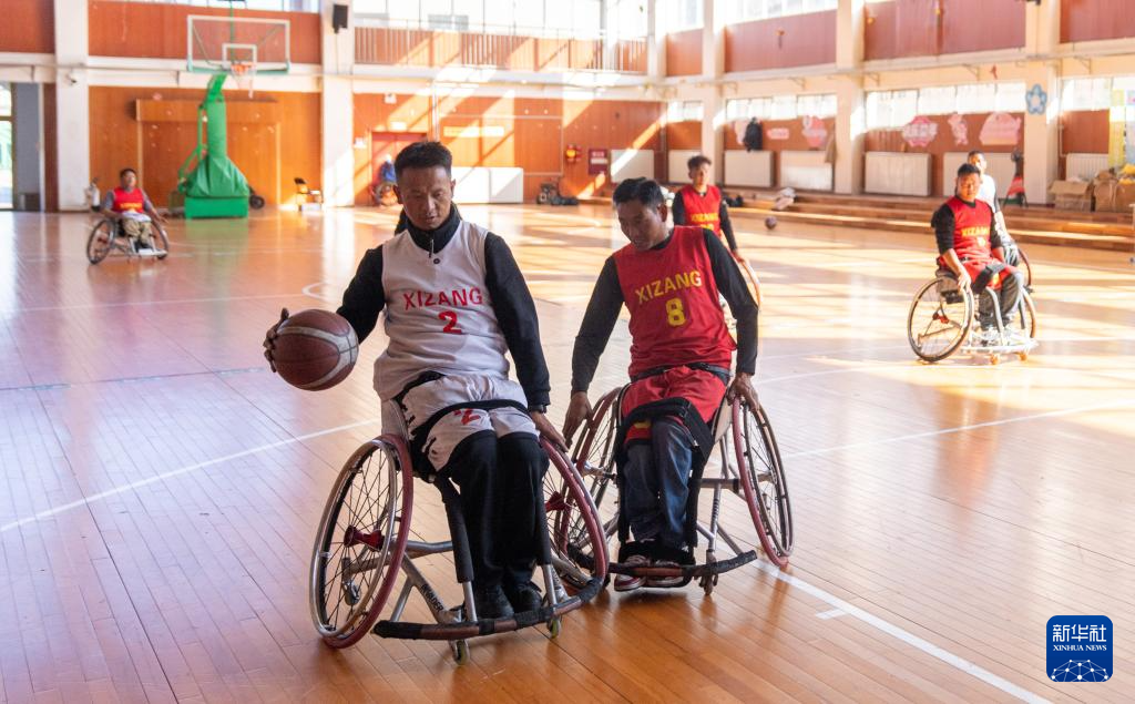 11月30日,西藏轮椅篮球队球员旦增(左)和队友在拉萨的训练场练球。